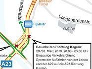Mittwoch, 31.03., 0:30 bis 04:00 Uhr: Sperre der Auffahrt von der Lobau bzw. von der A22 kommend auf die A23 Richtung Süden. Eine Umleitungsmöglichkeit führt über die A 22 Fahrtrichtung Stockerau über die Abfahrt Kaisermühlen umkehren und die A 22 Richtung A 23 wieder auffahren. Bis Mitte Juni ist die Auffahrt dann einspurig befahrbar.
