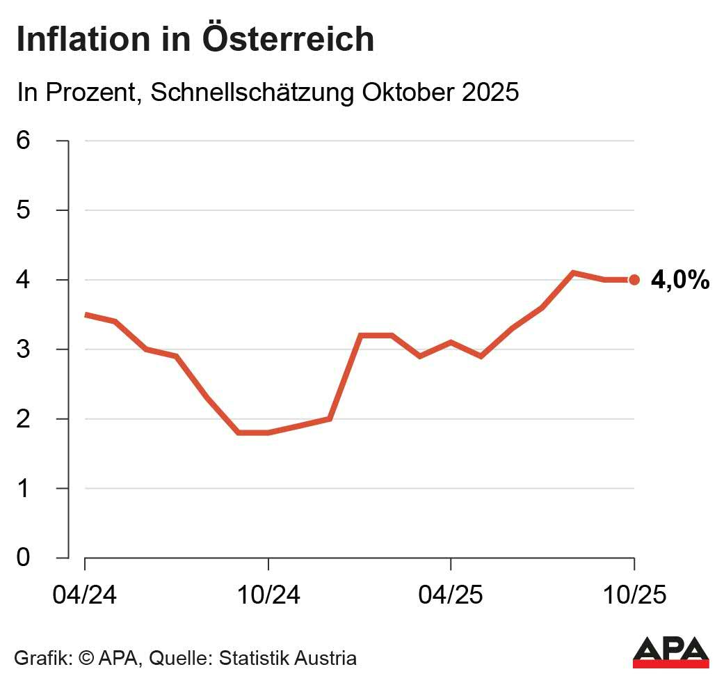 Inflation in Austria remained consistently high in October. According to a quick estimate by Statistics Austria, the inflation rate was 4.0 percent, the same as in September. Compared to the previous month, the general price level rose by 0.4 percent. Thus, prices in Austria continue to rise significantly more than in other countries of the Eurozone, where inflation slowed to 2.1 percent in October.