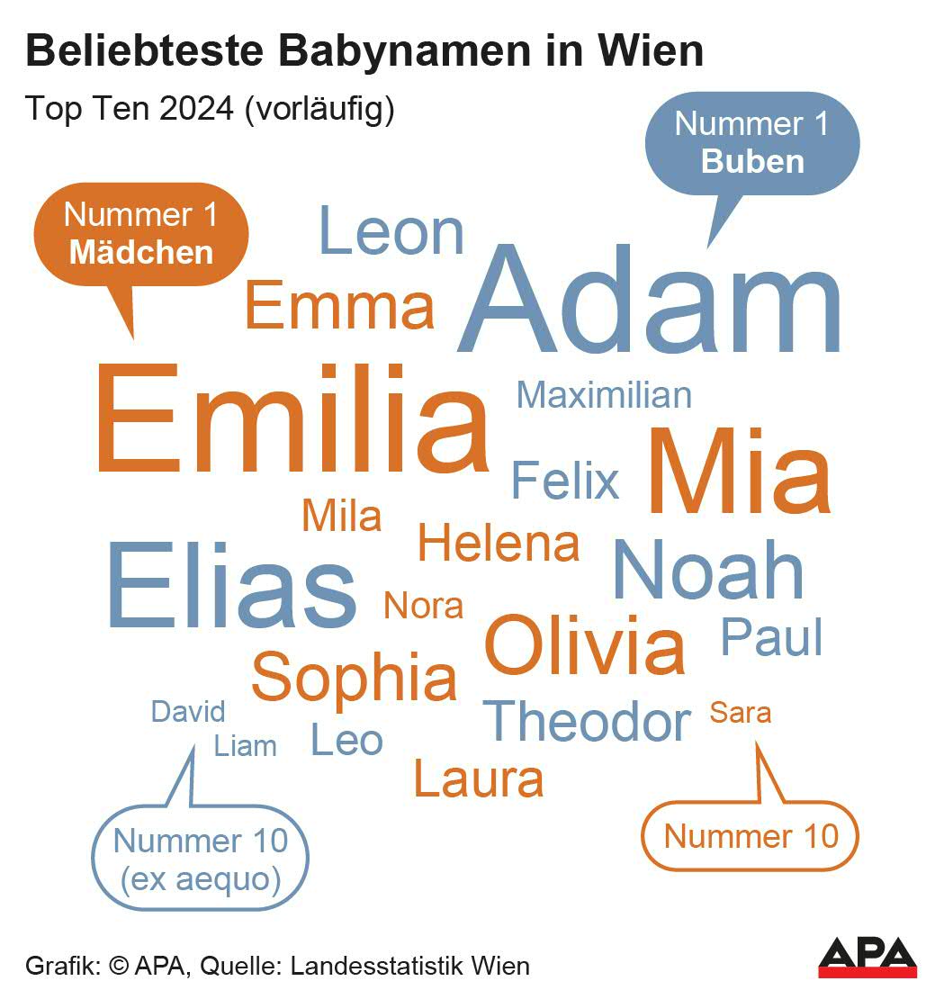 Emilia und Adam setzten sich 2024 als beliebteste Babynamen Wiens durch