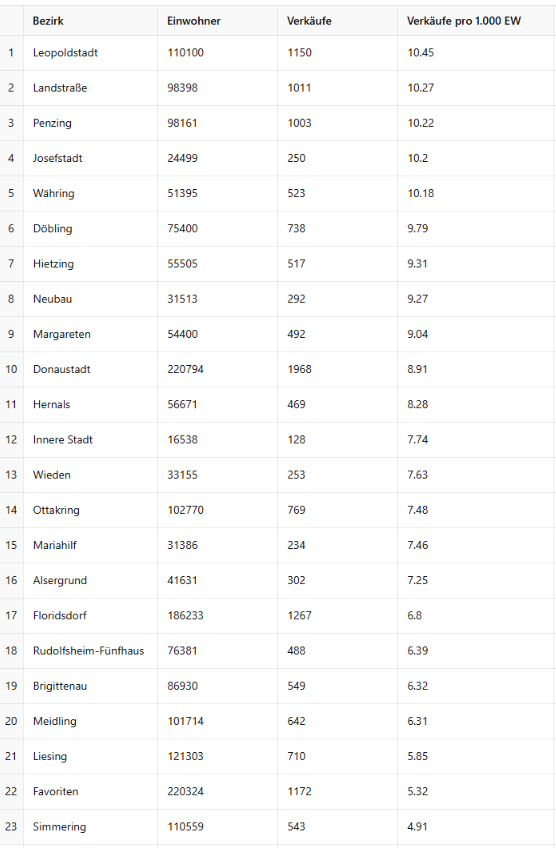 Die jeweiligen Schlusslichter in dem Ranking sind die Wiener Innenstadt mit 128 Verkäufen bzw. Wien-Simmering mit 4,91 Verkäufen pro 1.000 Einwohner. Die folgende Tabelle zeigt einen Überblick zu allen Wiener Bezirken.