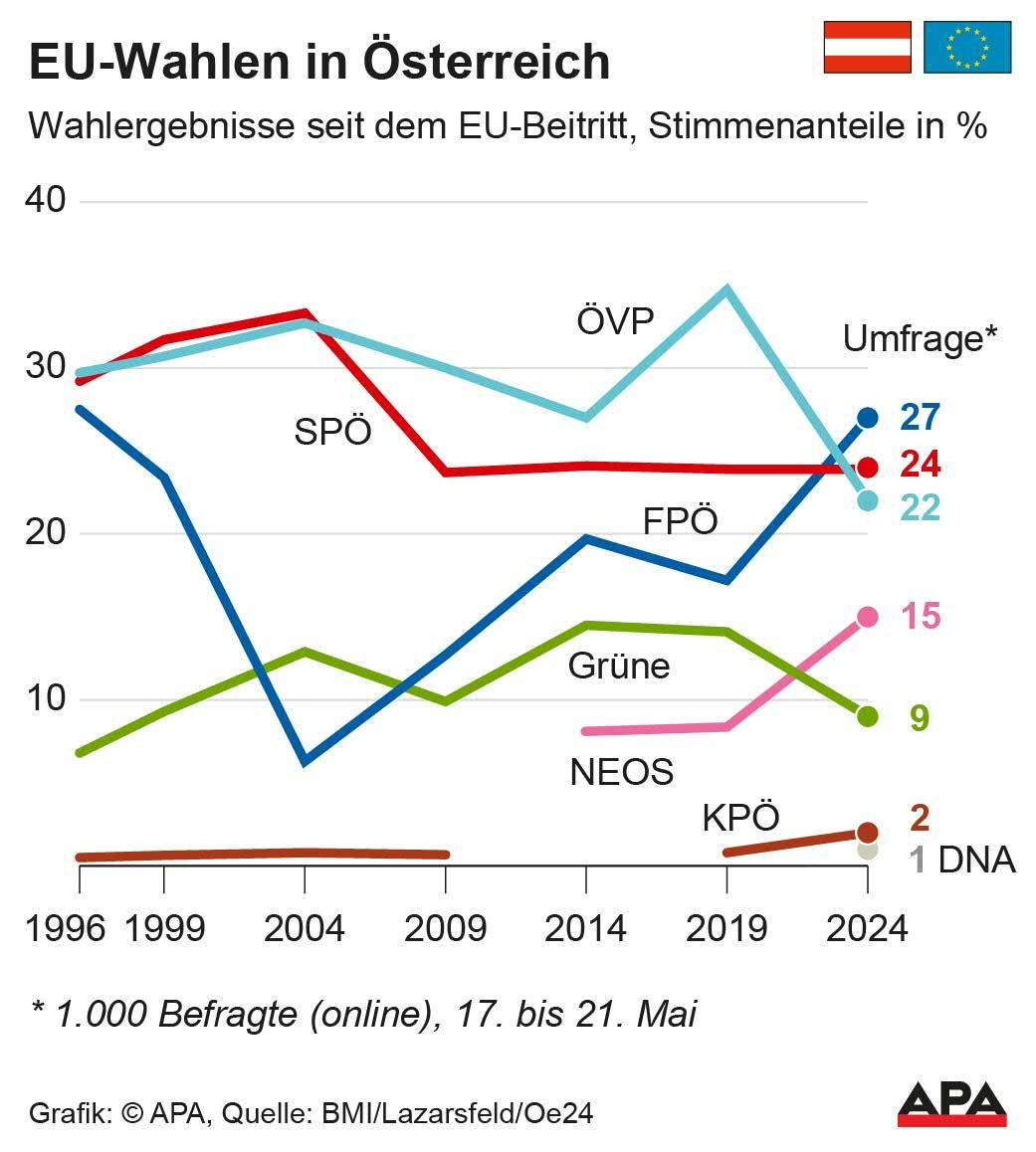 Für heuer könnte es laut Umfragen eine Premiere geben: Diese sagen der FPÖ Platz 1 voraus mit bis zu 30 Prozent der Stimmen. SPÖ und ÖVP ringen demnach um Platz zwei (bei ca. 23 Prozent), vor den Grünen und NEOS mit jeweils ca. 10 Prozent.