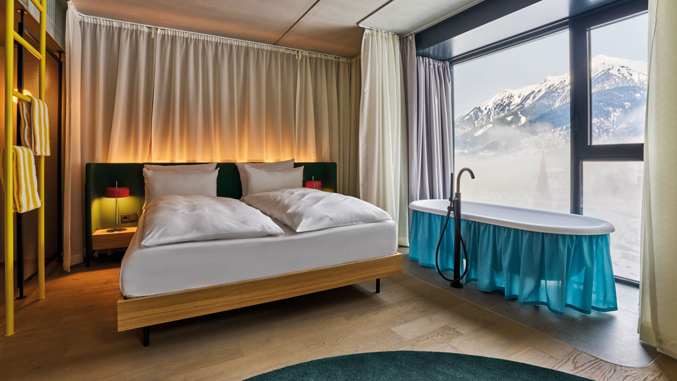 Right by the legendary waterfall and in the heart of the high alpine landscape of Bad Gastein, the Urban Nature Hotel in the Badeschloss celebrates a new dimension of lifestyle. Built in 1791 amidst a breathtaking setting directly at the Bad Gastein waterfall, the former bathhouse at Straubingerplatz has always been frequented by great personalities. Although the house is the oldest of the building ensemble on the iconic Straubinger Platz, with its playful, colorful interior design, it stands for young, contemporary bathing and accommodation culture. The house, as well as the Grand Hotel Straubinger, is managed by hotel director Anzé Smlatic.