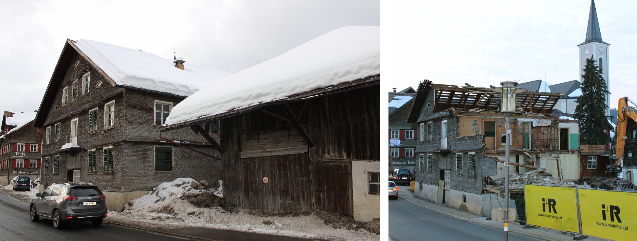 Lange wurde geplant, diskutiert, rechtliche Fragen abgeklärt und um eine Lösung gerungen, jetzt wurden Fakten geschaffen: das ehemalige Gasthaus Kreuz – seit Jahrzehnten leerstehend – wurde dieser Tage abgerissen, aktuell räumen die Bagger die letzten Reste weg. Damit setzt Alberschwende einen ersten Schritt in eine neue Wohn-Ära, denn an Stelle des früheren Wirtshauses entsteht eine gemeinnützige Wohnanlage – die erste in der Gemeinde, die damit dem Beispiel mehrerer Vorderwaldgemeinden folgt und sich ebenfalls dem Mietwohnbau öffnet.