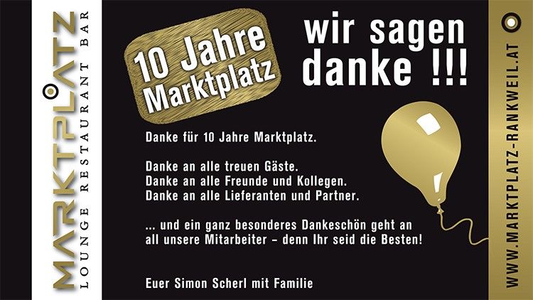 Seit 10 Jahren ist das Marktplatz Restaurant mit seinem 15-köpfigen Team für viele schöne Dinge bekannt: Als ein idealer Ort, um mit allen Sinnen gediegenes Ambiente, entspannende Musik, aufmerksamen Service, exklusives Essen und erlesene Getränke zu genießen. Wir bedanken uns für die langjährige Treue unserer Gäste und aller Mitarbeiter, die uns diese 10 Jahre begleitet haben. Wir freuen uns auf weitere 10 Jahre. Simon Scherl mit Team.