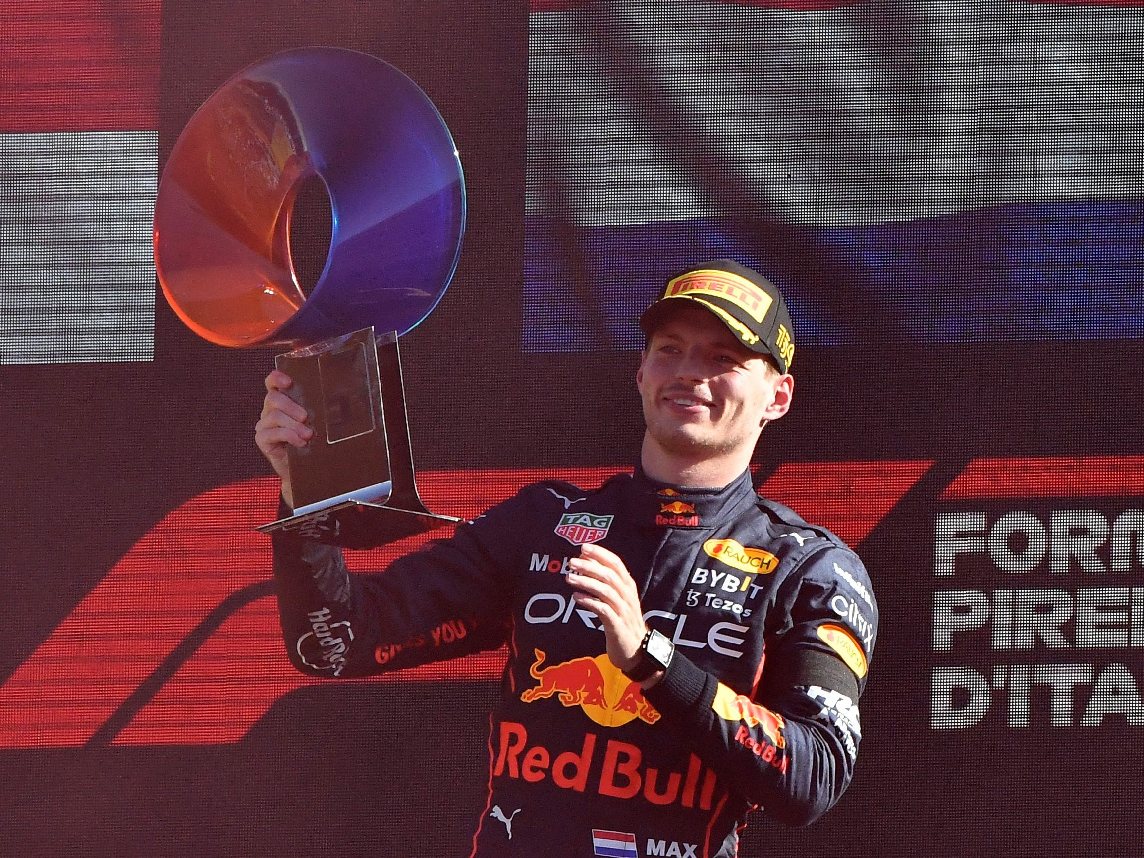 ©Formula One F1 - Italian Grand Prix - Autodromo Nazionale Monza, Monza, Italy - September 11, 2022 Red Bull's Max Verstappen celebrates with the trophy on the podium after winning the Italian Grand Prix REUTERS/Jennifer Lorenzini