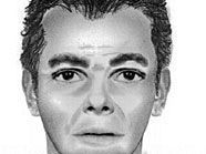 4050 Jahre, dunkle kurze volle Haare, ca. 180 cm, mittlere Statur, Kinnbart, bekleidet mit orange-rotem Kurzarm T-Shirt und blauen Jeans, großes Muttermal am Hals.