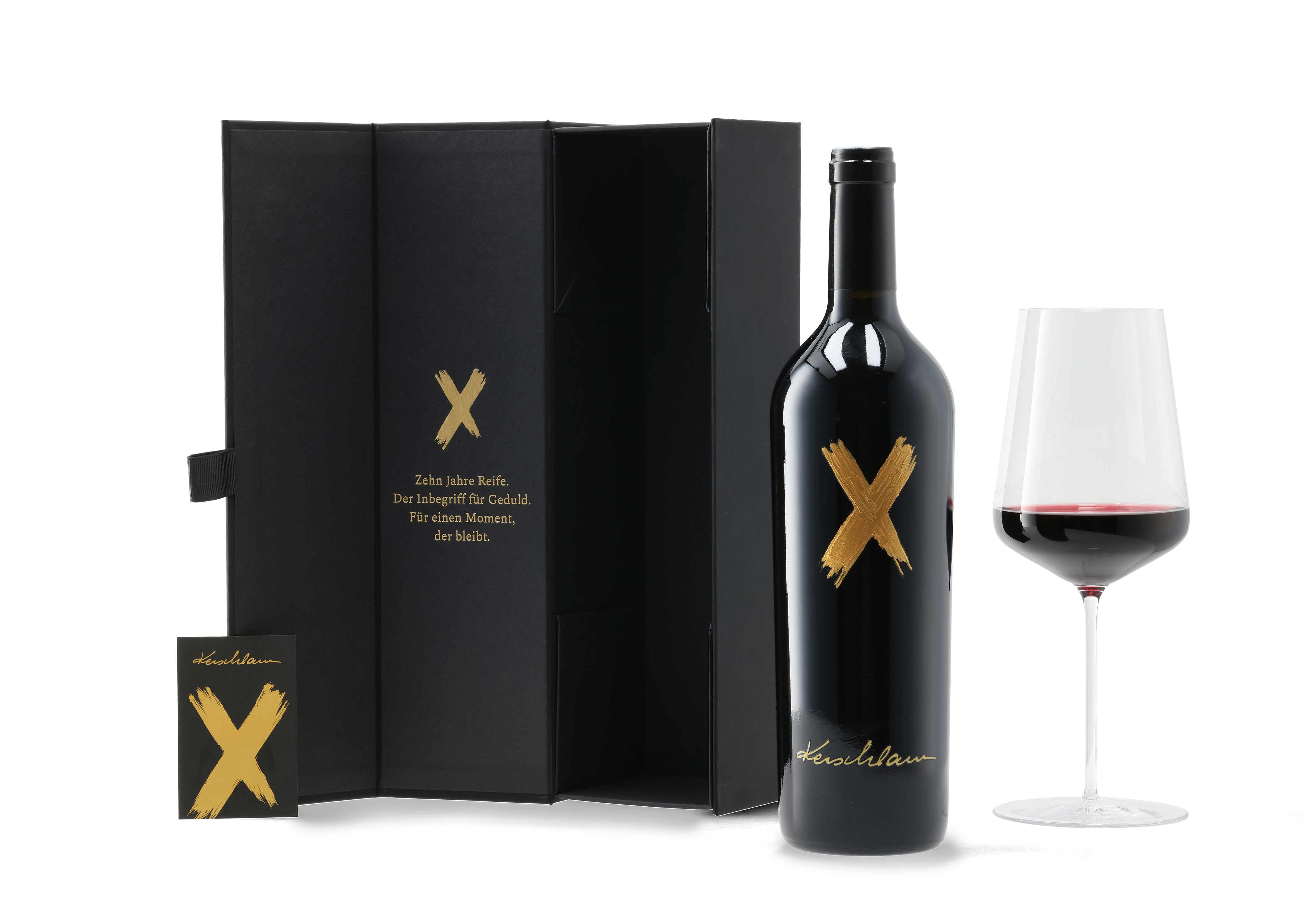 Jede Flasche trägt ein von Hand gemaltes, goldenes "X"-Symbol für die Zahl Zehn, für Geduld, Reife und das Besondere - und wird in einer eleganten schwarzen Verpackung mit der Inschrift "Zehn Jahre Reife. Der Inbegriff für Geduld. Für einen Moment, der bleibt." geliefert.