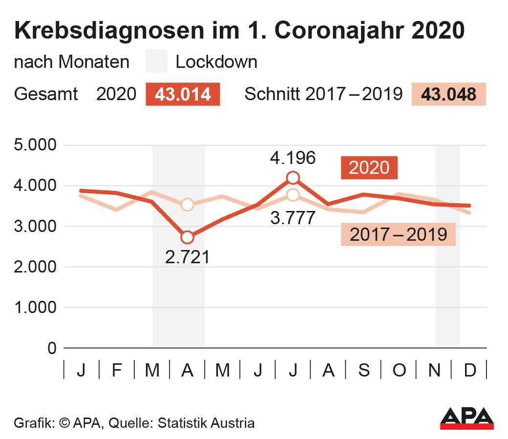Laut Statistik Austria gab es im Jänner und Februar um rund 540 Neudiagnosen mehr als im Durchschnitt der Vorjahre. Dann kam der Pandemiebeginn. Von Oktober bis November wurden im Vergleich zu den Vorjahren rund 220 Diagnosen weniger gestellt, während im Dezember die Zahl der Krebsneudiagnosen um knapp 180 Fälle über dem Durchschnitt der Vorjahre lag.