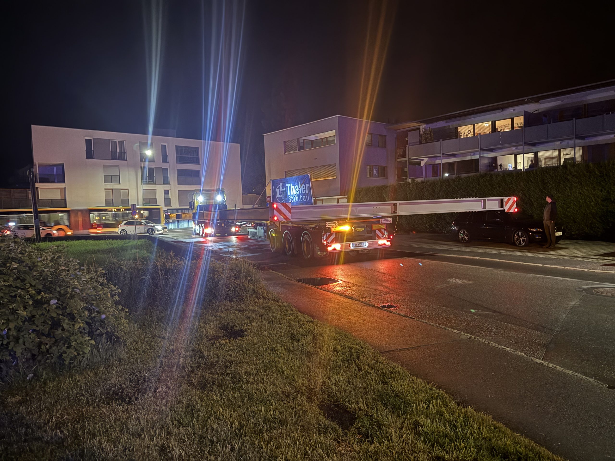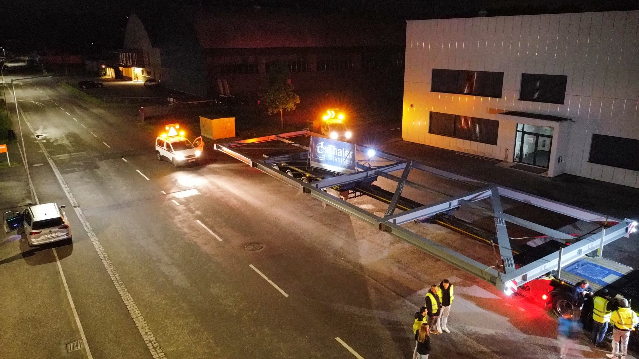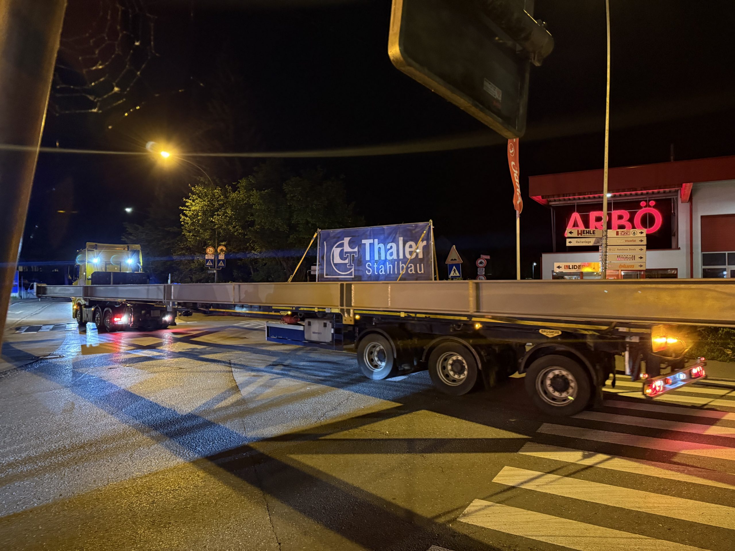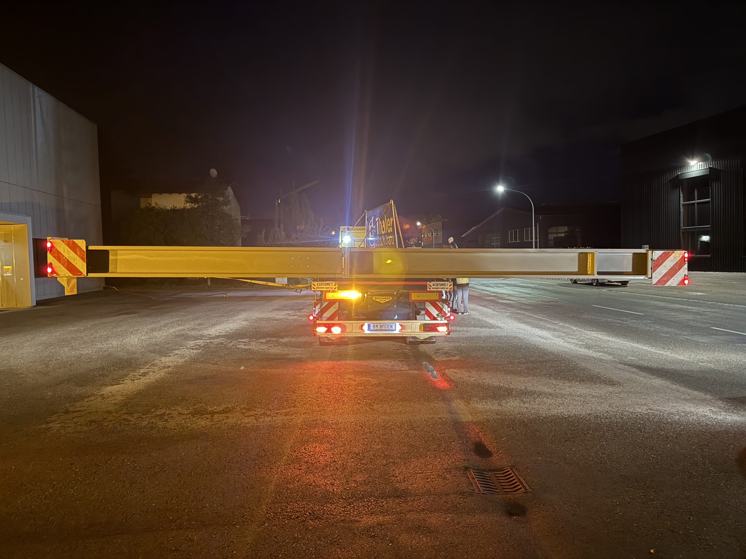 Nach monatelanger Planung verließ das tonnenschwere Stahlfachwerk am Montagabend um 22 Uhr das Werk in Hard. Die große Herausforderung war, die Konstruktion so zu dimensionieren, dass sie auf öffentlichen Straßen transportiert werden kann. Den Spezialtransport übernahm das Harder Unternehmen Hämmerle Transporte.