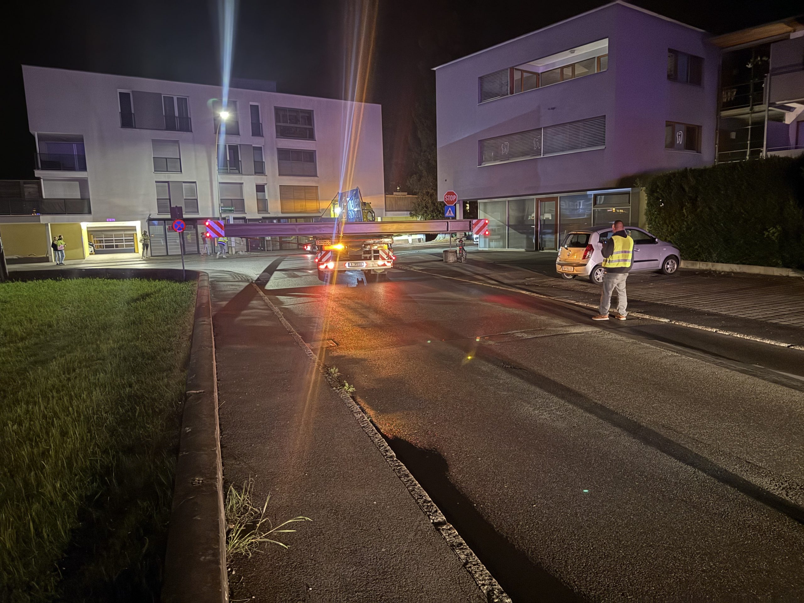 Geliefert wurden die Teile zum Werk 4 der Fa. Julius Blum, wo sie am Dienstagvormittag mittels Mobilkran an den Ort der Bestimmung gehoben werden. Hier entstehen neue Bürogebäude, Besprechungsräume und ein Empfangsraum für Besucherinnen und Besucher, erklärt der Presseverantwortliche Samuel Dürr im VOL.AT-Interview. Man kenne sich bei Blum mit schwerem Gerät aus, aber solche Transporte stünden auch hier nicht an der Tagesordnung, so Dürr. Mit dem gelieferten Stahlfachwerk werde die Bauetappe 17 abgeschlossen.