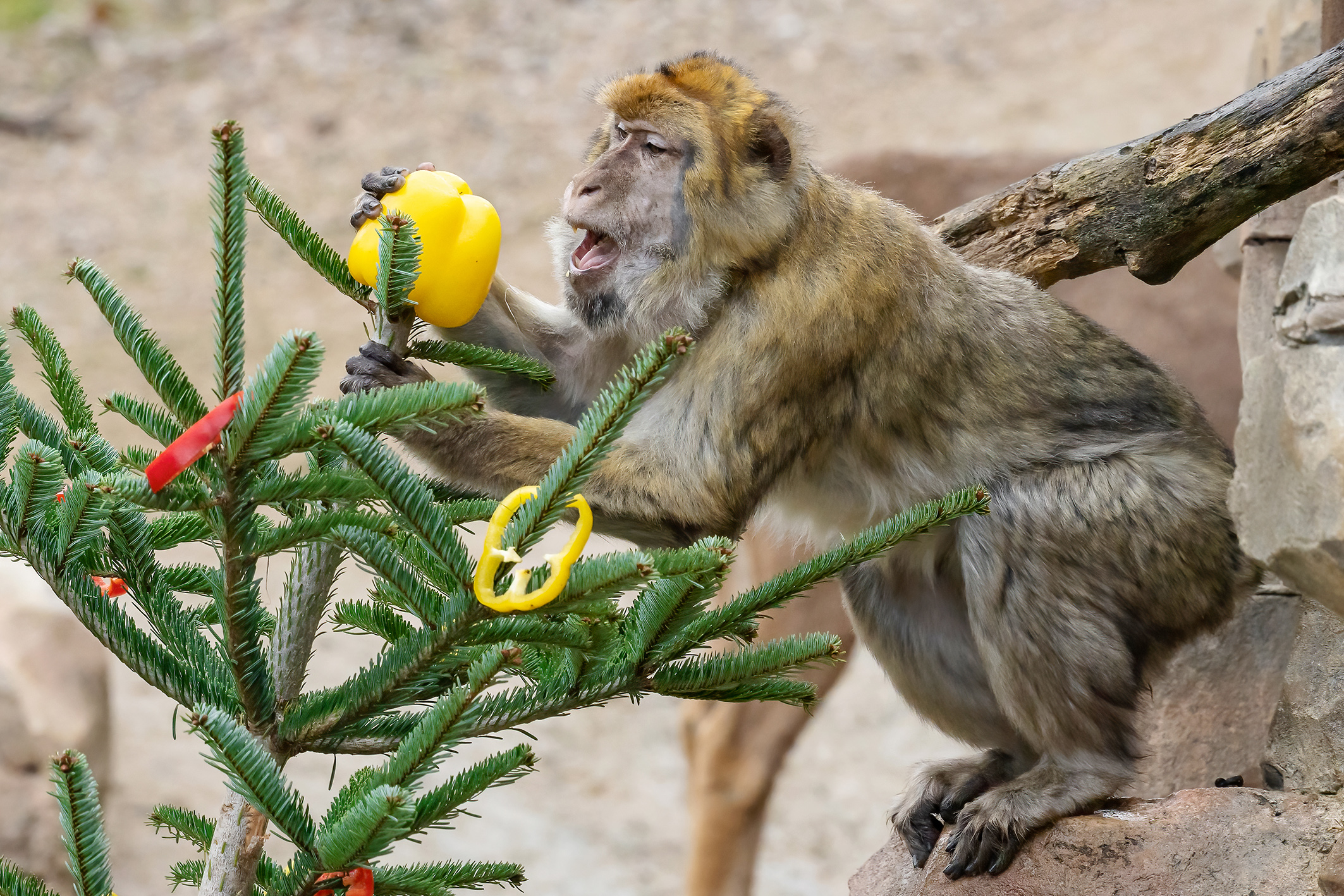 "Das viele Obst fressen in erster Linie unsere Vogelarten", erzählte Futtermeister Michael Kober. "Bei den meisten Säugetieren ist Obst aufgrund des hohen Zuckergehalts nur ein Leckerbissen." Futterspezialisten sind die Großen Pandas mit 27 Tonnen Bambus pro Jahr und die Bärenstummelaffen, die das ganze Jahr über Blätter brauchen. Dazu werden Blätter für den Winter tiefgefroren. Manches am Futterplan mag überraschen: So wird für die Orang-Utans ein zuckerfreies Biskuit gebacken. Die Elefanten, die riesige Mengen an Heu vertilgen, schätzen auch Zwiebel - wegen der ätherischen Öle.