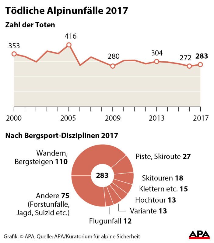 • 283 Menschen starben 2017 in Österreichs Bergen