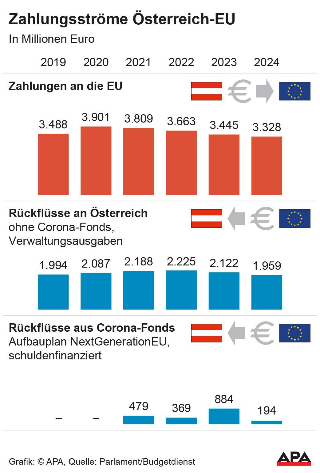 Not included in the returns are the EU funds that Austria has been receiving since 2021 from the Corona Recovery Fund "NextGenerationEU" (NGEU). These funds are jointly debt-financed by the EU and must be repaid from 2028. Also excluded are EU administrative expenses. From NGEU, Austria received 479 million euros in 2021, 369 million euros in 2022, 884 million euros in 2023, and 194 million euros in 2024.