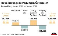 Österreich geht bei der Bevölkerungszahl auf die Neun-Millionen-Marke zu: Nach Angaben der Statistik Austria lebten am 1. Jänner 2019 knapp 8,86 Millionen Menschen in Österreich, das sind um 0,41 Prozent oder 36.508 Menschen mehr als am 1. Jänner 2018. Allerdings hat sich der Bevölkerungszuwachs gegenüber 2017 deutlich verlangsamt – damals betrug der Zuwachs noch 0,56 Prozent oder 49.402 Menschen.