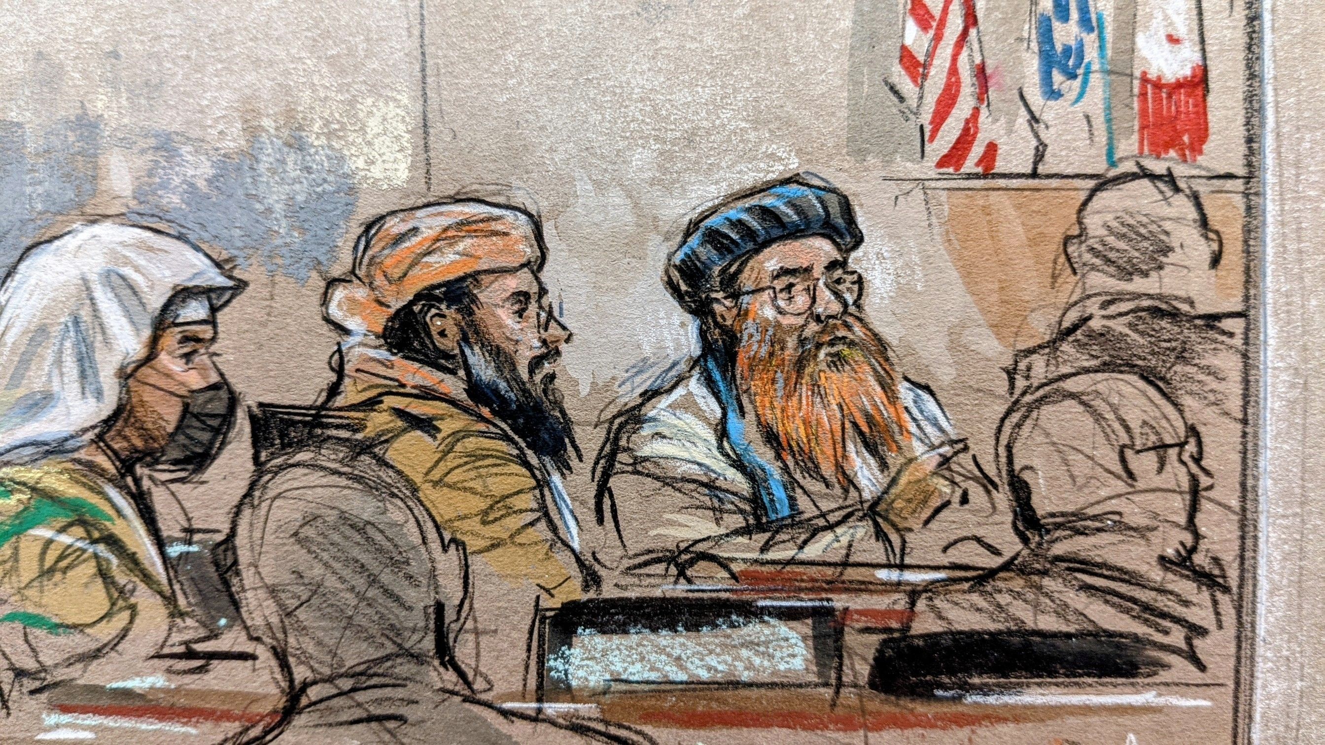 Khalid Sheikh Mohammed (r.), Ramzi Binalshibh (l.) und Walid bin Attash (m.) in einer Gerichtszeichnung vom 7. September 2021. ©APA/AFP