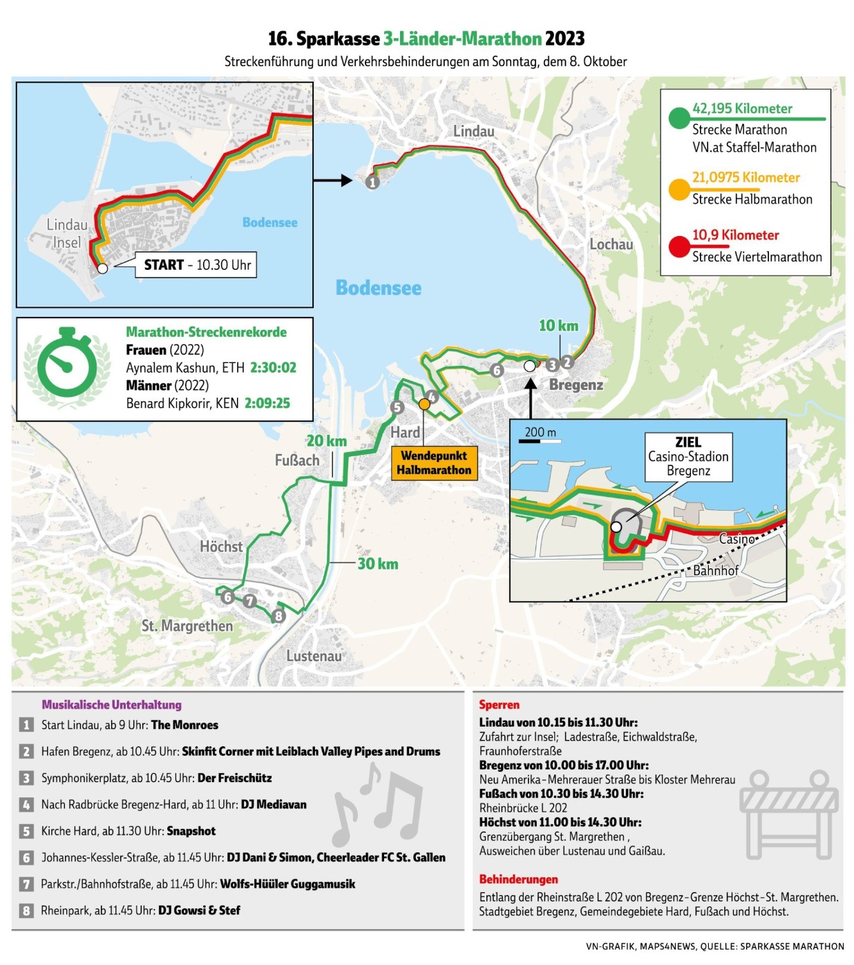 Sportlich wird die 16. Auflage auch interessant. Die Teilnahme des 46jährigen Kenianers Mark Kiptoo, dem aktuellen Masters-Weltrekordhalter auf der Marathon-Distanz ist schon länger bekannt. Kiptoo stellte in der Altersklasse M45 mit 2:09:12 im Frühjahr in Zürich eine neue Bestmarke auf. Am 8. Oktober will er diese Zeit noch einmal unterbieten. Schafft er das, stellt er auch einen neuen Streckenrekord am Bodensee auf. Dieser wurde im vergangen Jahr vom Kenianer Kipkori Benard mit 2:09:25 erlaufen.