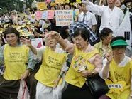 Die erstmalige offizielle Bitte um Entschuldigung des japanischen Ministerpräsidenten Naoto Kan ist ihrer Ansicht nach ohne materielle Entschädigung unzureichend. “Ihr habt kein Gewissen!”, rief eine 84-jährige Koreanerin, die in ein japanisches Militärbordell verschleppt worden war, bei der Kundgebung am Mittwoch.