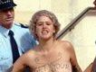 Eine junge Frau, die auf einer Mauer stand, zog ihr Hemd hoch und streckte dem Thronfolger ihre entblößten Brüste entgegen. Schande über die Kolonisierung rief die 23-Jährige, bevor sie von der Polizei abgeführt wurde.