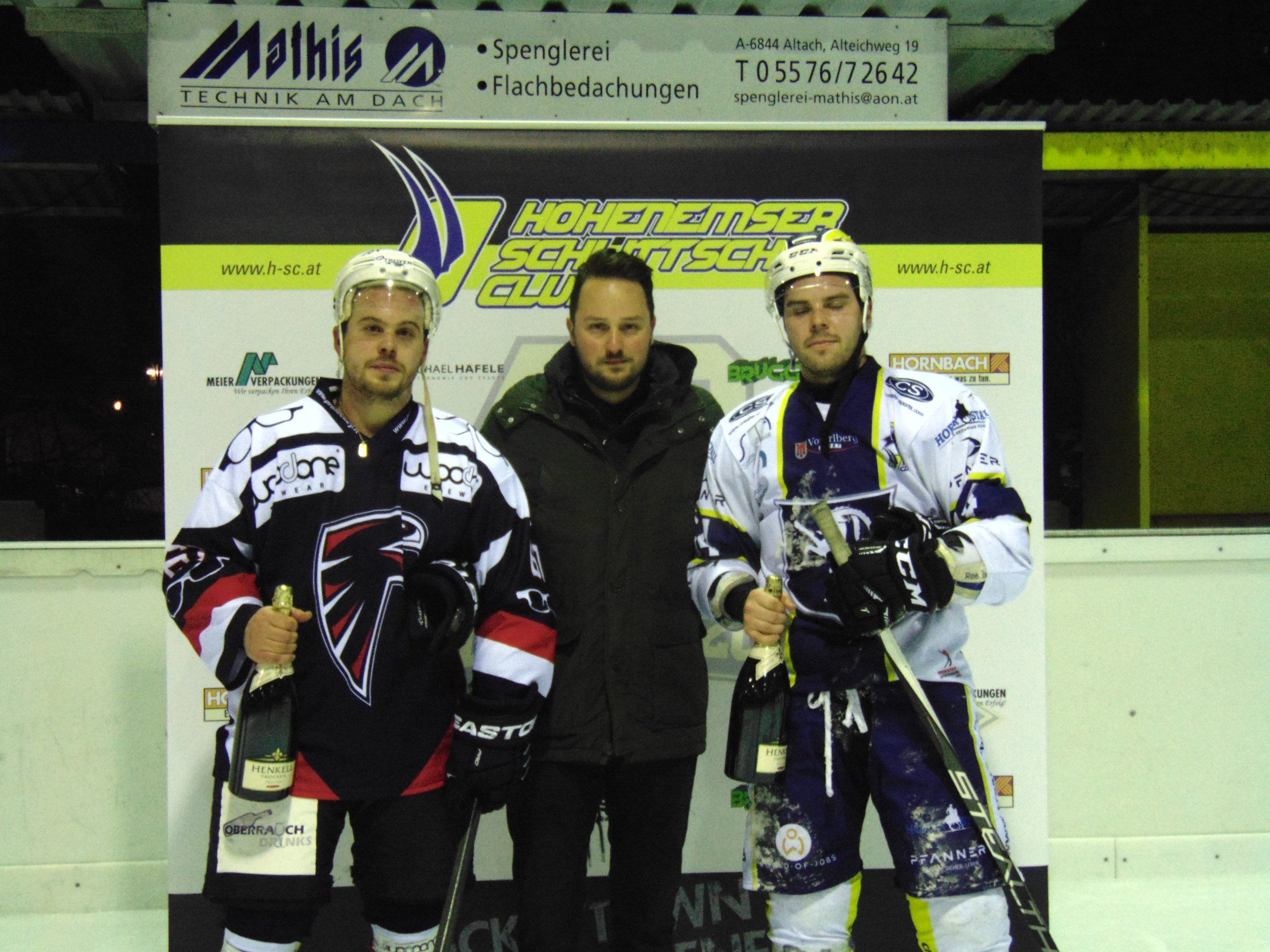 Der Schlussabschnitt gestaltete sich dann ausgeglichener und auch die Gäste aus dem Südtirol kamen immer wieder gefährlich vor das Tor von Matthias Fritz. Oliver Schenk bringt dann die Falcons in der 46. Minute erstmals an diesem Abend in Führung – 2:3. Die Antwort der Gastgeber ließ dann aber nicht lange auf sich warten und Roman Scheiber trifft erneut im Powerplay zum 3:3. Gästetorhüter Kinkelin machte in weiterer Folge zahlreiche gute Emser Möglichkeiten zu nicht und hielt sein Team im Spiel. In der 53. Minute passt Christian Gmeiner dann allerdings ideal auf Johnny Hehle und dieser trifft zum 4:3 für Hohenems. Brixen riskiert in der Endphase dann alles, nimmt im Powerplay den Torhüter vom Eis und versucht mit sechs Feldspielern noch den Ausgleich zu erzielen. Doch Roman Scheiber kann sich dann die Scheibe schnappen und trifft zum 5:3 ins leere Tor. 40 Sekunden vor Ende kann Christian Sottsas zwar noch zum 5:4 verkürzen, doch der SC Hohenems feiert am Ende einen knappen, aber verdienten Erfolg und öffnet die Play-off Tür.