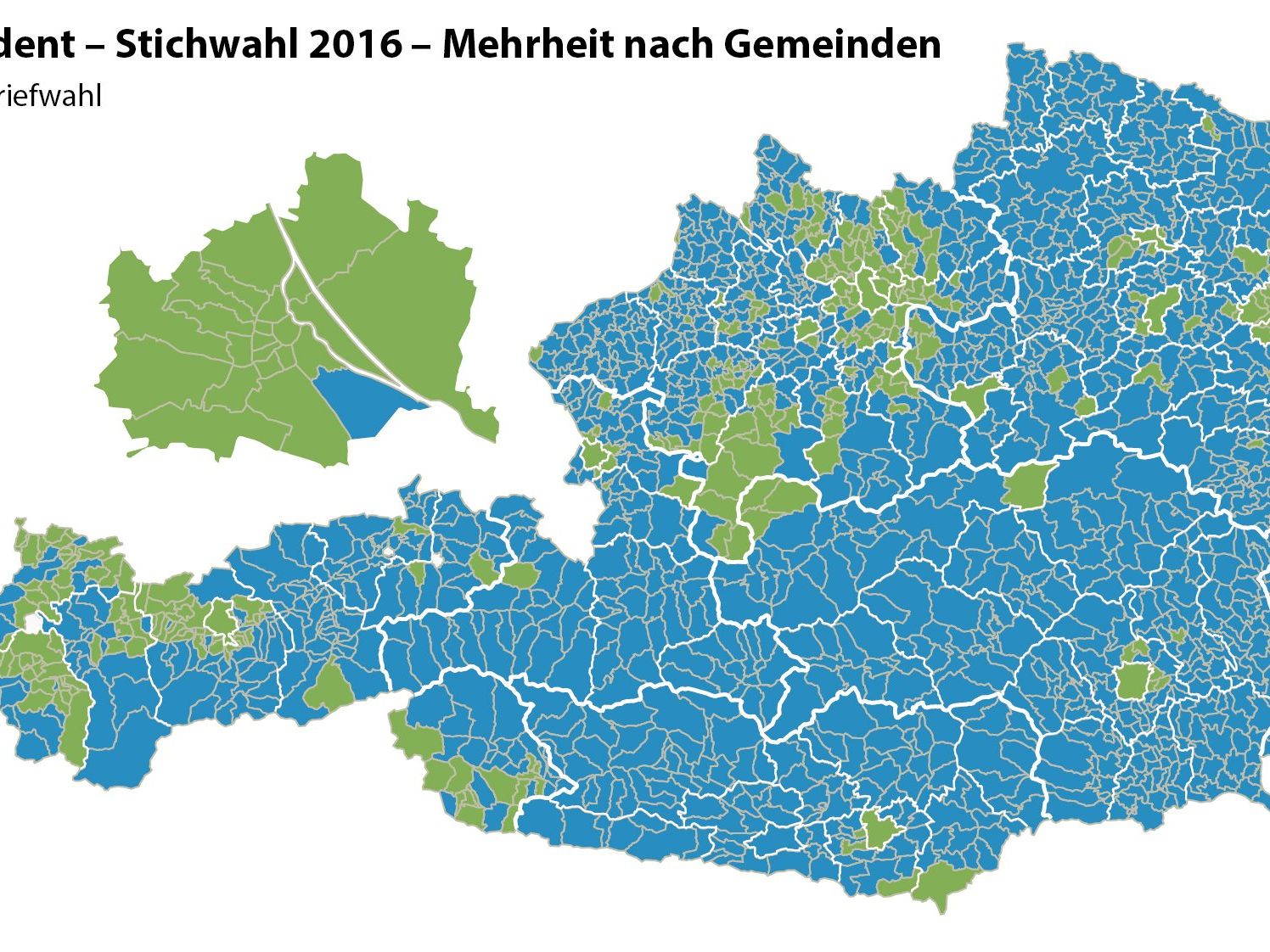 Aus Kärnten kam ein weiteres Plus von 4.000 Stimmen für Van der Bellen. In Wien baute der Grüne (mit letztlich 63,32 Prozent) den Vorsprung auf Hofer von 135.119 Stimmen mit der Briefwahl auf 209.560 aus. In der Steiermark blieb zwar Hofer mit 56,22 Prozent (am Wahlsonntag waren es noch 58,68 Prozent) vorne. Aber durch die Briefwähler schmolz sein Vorsprung gegenüber dem Grünen von ursprünglich fast 97.000 auf nach der Briefwahl nur mehr rund 85.000 Stimmen. Van der Bellen steigerte sich von 41,32 auf 43,78 Prozent.