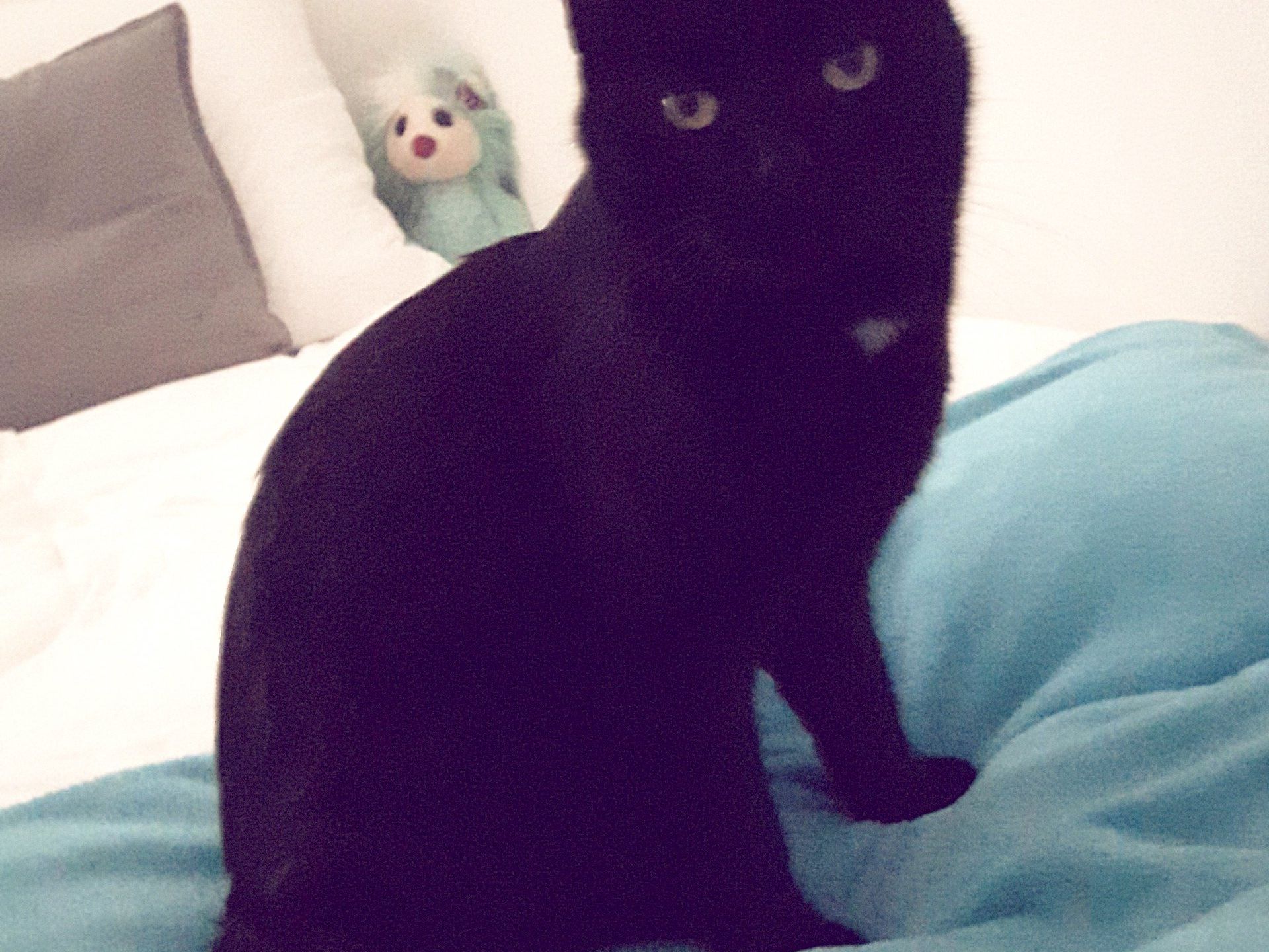 Er ist schwarz, schlank, hat auffallend hellgrüne Augen und einen weißen Fleck auf der Brust.Â