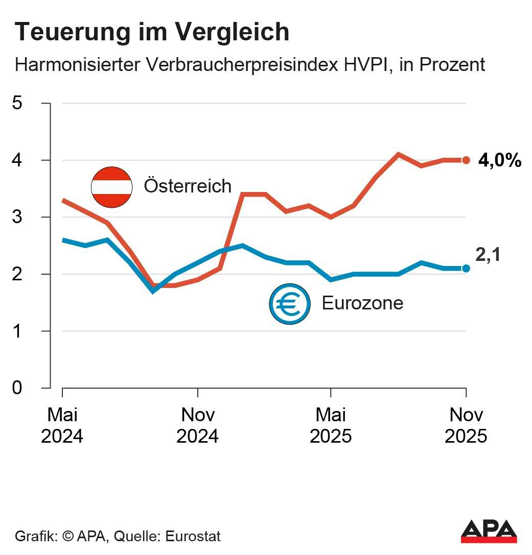Die Inflation in Österreich ist weiterhin fast doppelt so hoch wie im Euroraum. Im November lagen die Preise hierzulande um durchschnittlich 4,0 Prozent über jenen vom November 2024. Die Inflation ist damit den dritten Monat in Folge unverändert hoch, wie die Statistik Austria am Mittwoch mitteilte. Der endgültige Wert fiel etwas niedriger aus als in der Schnellschätzung Anfang Dezember. In der Eurozone blieb die Inflation laut EU-Statistikamt Eurostat bei 2,1 Prozent.