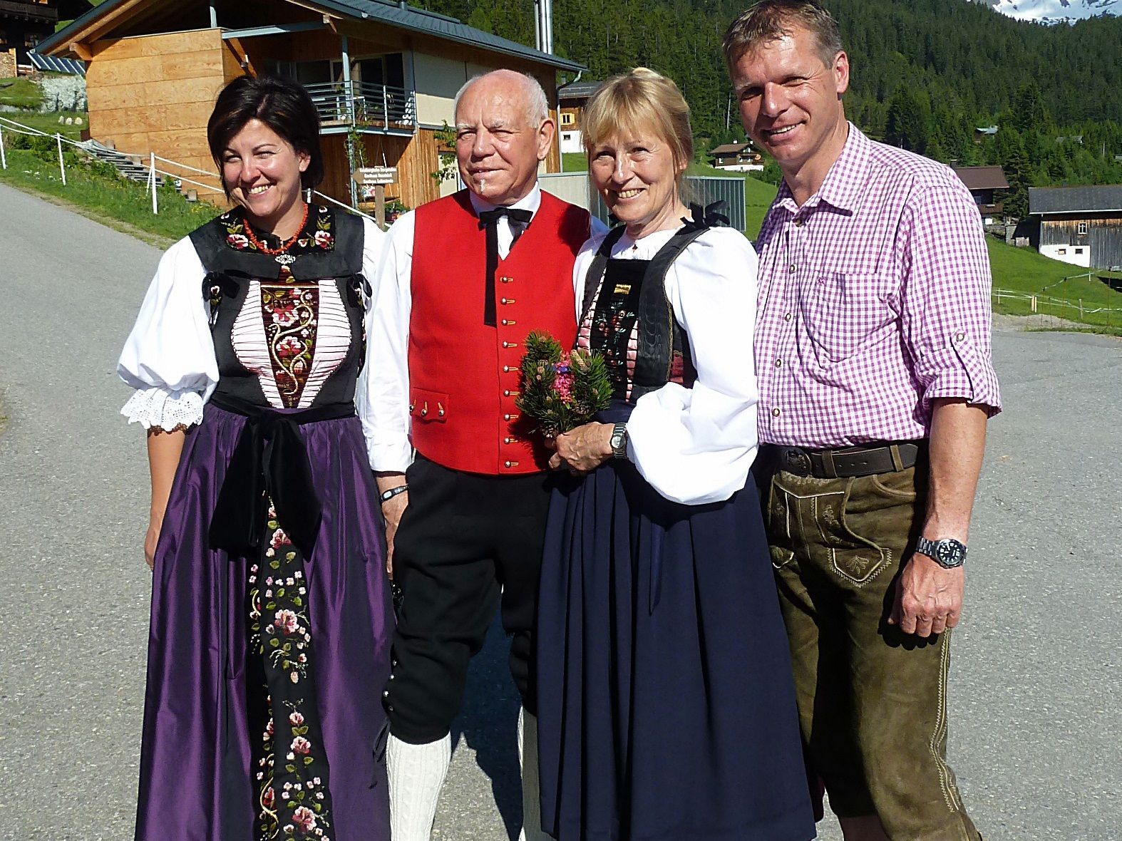 Anton Schnetzer wurde von seiner Freundin Lorraine, Sohn Bernd mit Christine, Tochter Carmen mit Kinder und Sohn Markus mit Birgit begleitet. Die Familie wurde bei der Kristbergbahn von den Montafoner Alphornfreunden musikalisch empfangen. Beim Alpengasthaus Kristberg stand dann „seine“ Trachtengruppe Spalier für ihn und der Jubilar freute sich sichtlich über diesen tollen Empfang. Priska Ganahl und Fredy Ganahl, ihreszeichens Vorstandmitglieder der Trachtengruppe Schruns, übermittelten ehrende und dankende Worte. Zudem überreichten sie Toni Schnetzer einen eigens zusammengestellten DVD-Band über alle TV-Auftritte der Trachtengruppe der letzten Jahrzehnte. Ehrenobmann und Langzeitgefährte Christian Fiel war mit seiner Frau Anni ebenfalls eingeladen. Er trug ein eigens geschriebenes Dialektgedicht über das Leben, Wirken und Werken von Toni Schnetzer vor: „viel wissens eh, all wer na kennt, der wäs, der Toni – der ischt  i allem a Talent!“ Zu den Gästen zählten auch Ehrenmitglied Anton Raunicher mit Tochter Heidrun, der ehemalige Tanzleiter Karlheinz Rinderer mit Angela und der Seniorchef des Alpengasthaus Kristberg Zudrell Adolf.