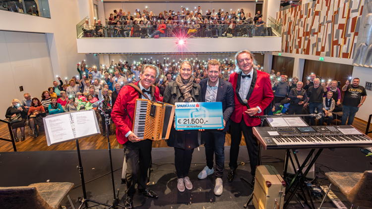 Diesmal zogen die beiden Küsntler zum Thema „Amore“ alle Register. Die Konzerte in Götzis, Nenzing, Lauterach, Lustenau, Egg und Rankweil mit insgesamt 2500 Besuchern waren im Handumdrehen ausverkauft. Bei der Abschlussveranstaltung im Rankler Vinomasaal überreichte AK-Präsident Bernhard Heinzle der Obfrau des Vereins Sonnenblume, Manuela Ortner, einen Scheck über 21.500 Euro. So einen hohen Gesamterlös hat die Veranstaltungsserie noch nie erzielt!