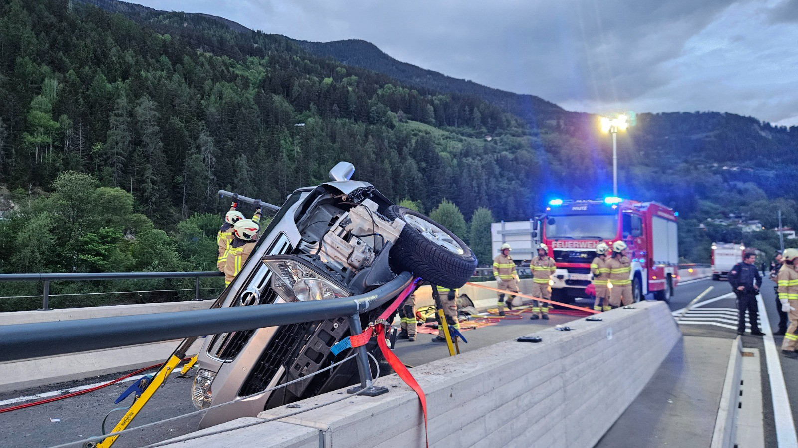 Das Fahrzeug kam in Schräglage zum Stillstand. Laut Einsatzkräften verhinderte nur das Geländer ein vollständiges Umkippen.