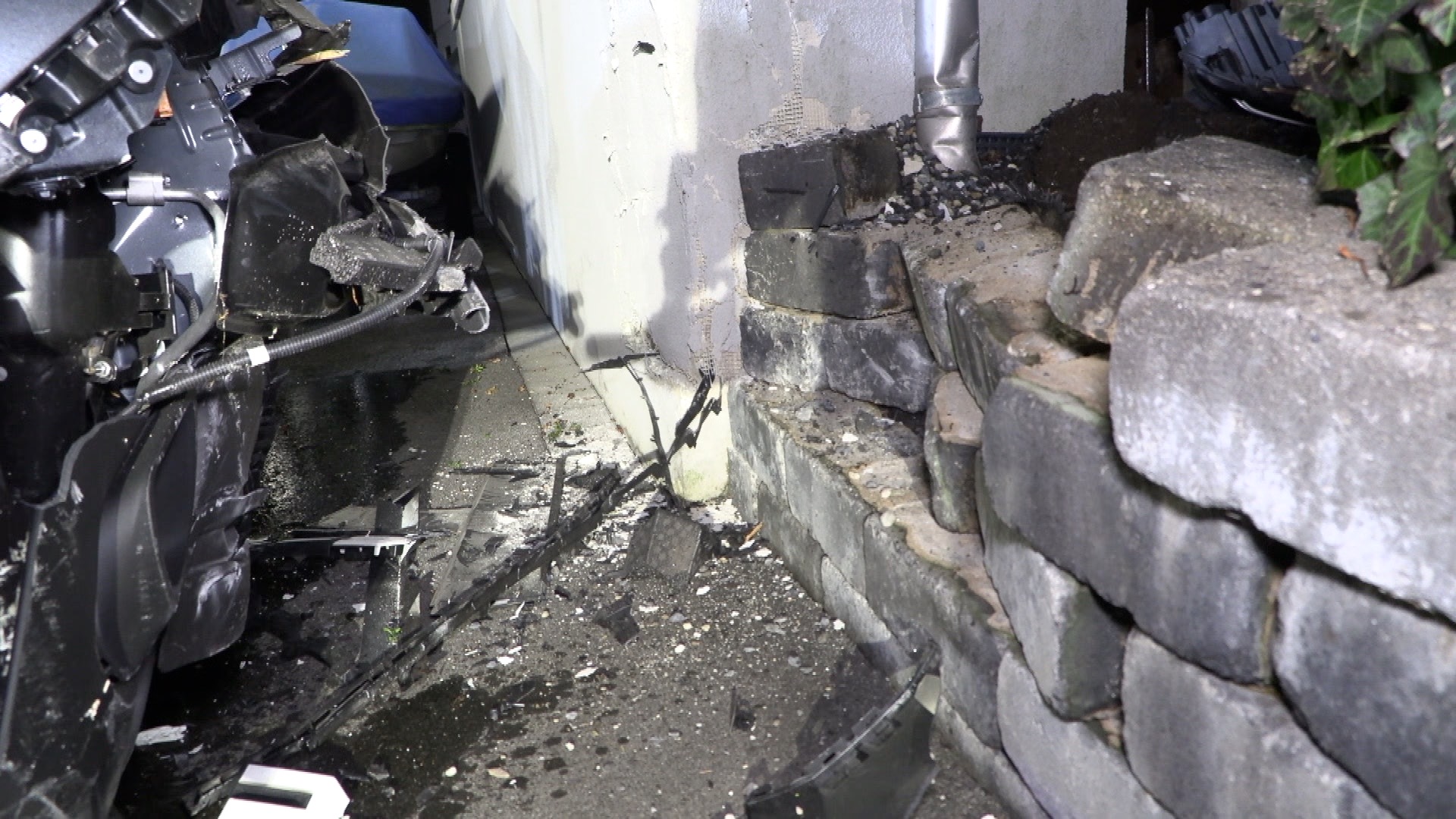 Der Wagen prallte zunächst gegen eine Gartenmauer und anschließend gegen die Fassade eines angrenzenden Einfamilienhauses. Auch ein geparktes Fahrzeug wurde bei dem Aufprall in Mitleidenschaft gezogen.