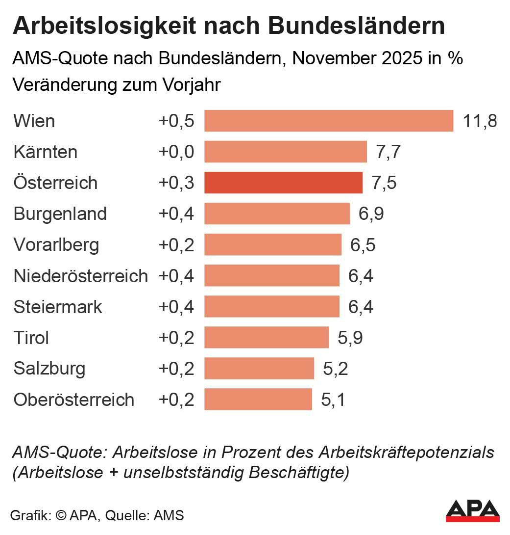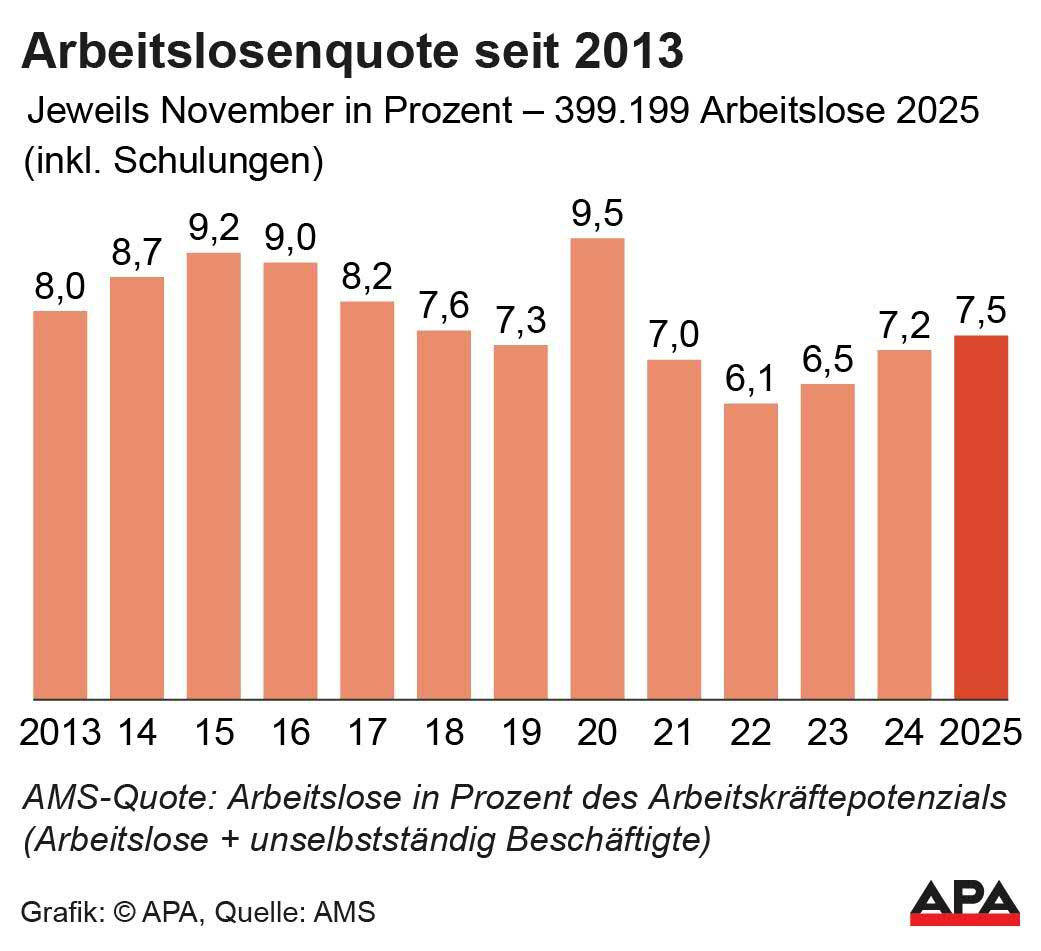 Im November entspannte sich die Lage am Arbeitsmarkt nicht. Laut Arbeitsmarktservice (AMS) waren am Monatsende 399.199 Menschen arbeitslos oder in Schulung, ein Anstieg um 4,0 Prozent bzw. 15.236 Personen im Vergleich zum Vorjahr. Dies markiert den 32. Anstieg in Folge seit April 2023. Die Arbeitslosenquote stieg im November um 0,3 Prozentpunkte auf 7,5 Prozent.