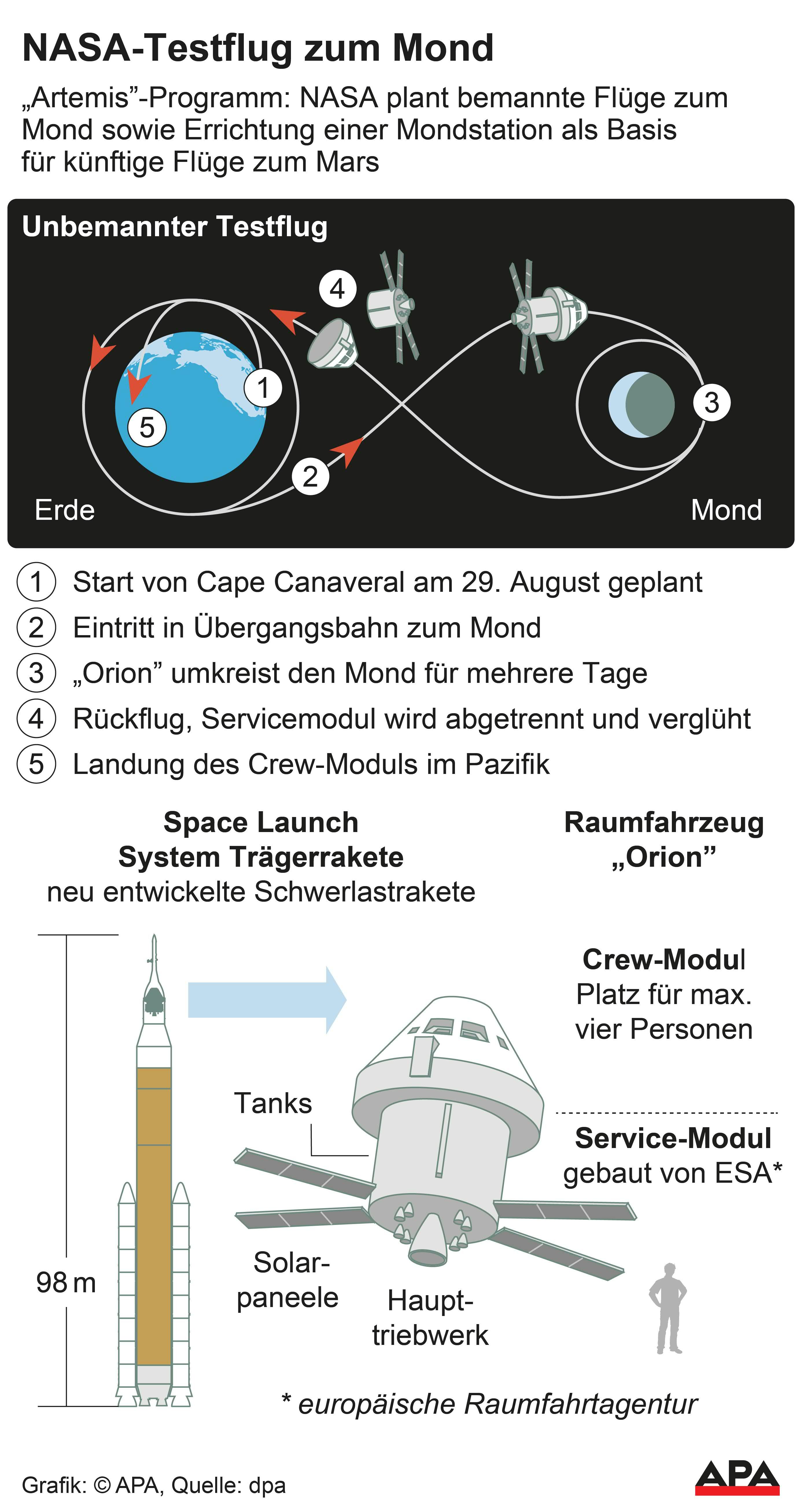 Im Rahmen der Mission "Artemis I" der US-Raumfahrtbehörde NASA soll das Raumschiff am Montag um 14.33 Uhr (MESZ) in Cape Canaveral starten und auf einem unbemannten, sechswöchigen Testflug um den Mond und zurück zur Erde fliegen. Mit an Bord ist auch Technologie aus Österreich.