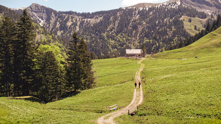 Es gibt verschiedene Wege rauf auf die Sattelalpe – von 15 Minuten bis zu 5 Stunden Wanderzeit. Die Belohnung ist immer gleich schön: Oben erwarten jeden Wanderer oder Biker malerische Alpwiesen mit Schweinen, Ziegen, Eseln, Pferden und Meffs Rindern – und eine deftige Jause mit Meffs eigenen Produkten.