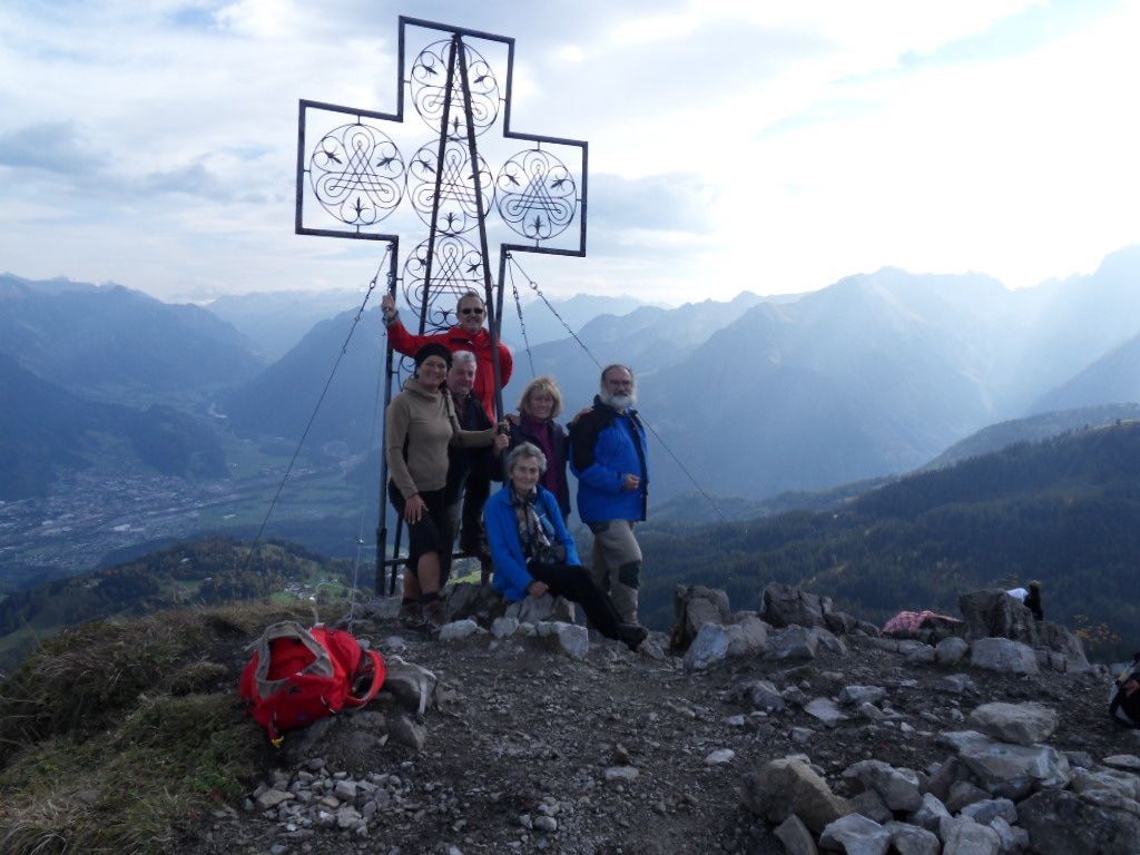 Unterwegs bei Kaiserwetter zeigten sich vielerlei Herbstblumen in ihren prächtigen Farben. Aufgefallen waren besonders die sattgelben Drollblumen. Ein erstes Highlight dieses Tages war der Anblick eines abgestorbenen Baumstumpfes mit der Form eines Bildstöckleins, das zu einem kurzen Verweilen im Hohlraum des Naturkunstwerkes einlud. Nach dem ersten Fotoshooting an diesem schönen Fleck ging’s zügig bergan dem ersten Gipfel entgegen. Dort bot sich ein herrlicher Rundblick auf die Bergwelt des Montafons und des Bregenzerwaldes während des Jausenstopps. Nach kurzer Mahlzeit folgte der Abstieg über den Mondspitzsteig, umrahmt von Latschen, zum Schillersattel, um anschließend das Kelliloch, einen atemberaubenden Krater, zu umrunden. Danach kam der steile Aufstieg zum eigentlichen Tagesziel, dem Schillerkopf (2006m). Anstelle des erwarteten Gipfelkreuzes war nur noch der Sockel vorhanden, da das morsch gewordene Holzkreuz aus Sicherheitsgründen abgebaut war. Diese Überraschung beeinträchtigte aber weder den Appetit auf die Rucksackverpflegung noch den Hochgenuss der Fernsicht. Nach dem Abstieg wurde die Tour mit einer kurzen Einkehr abgeschlossen. Dort war zufällig auch ein gut bekanntes Naturfreundepärchen aus dem Oberland anwesend, welches mit Mountainbikes unterwegs war.