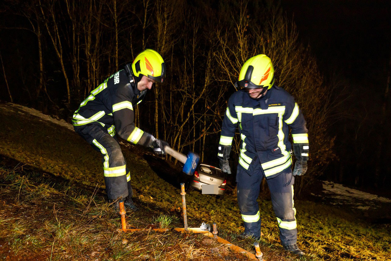 Einsatzkräfte der Feuerwehr sichern die Unfallstelle mit Erdankern für die Bergung des Fahrzeugs.