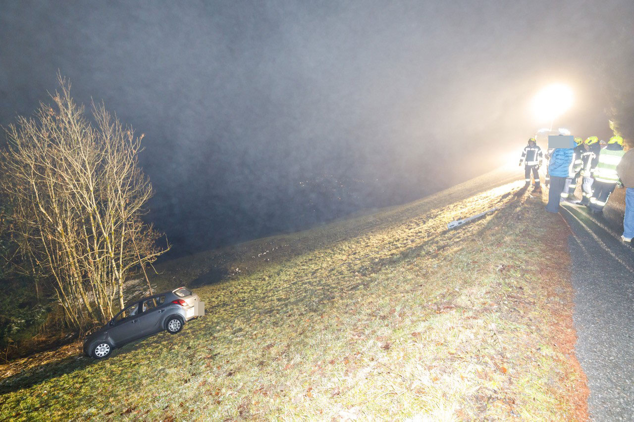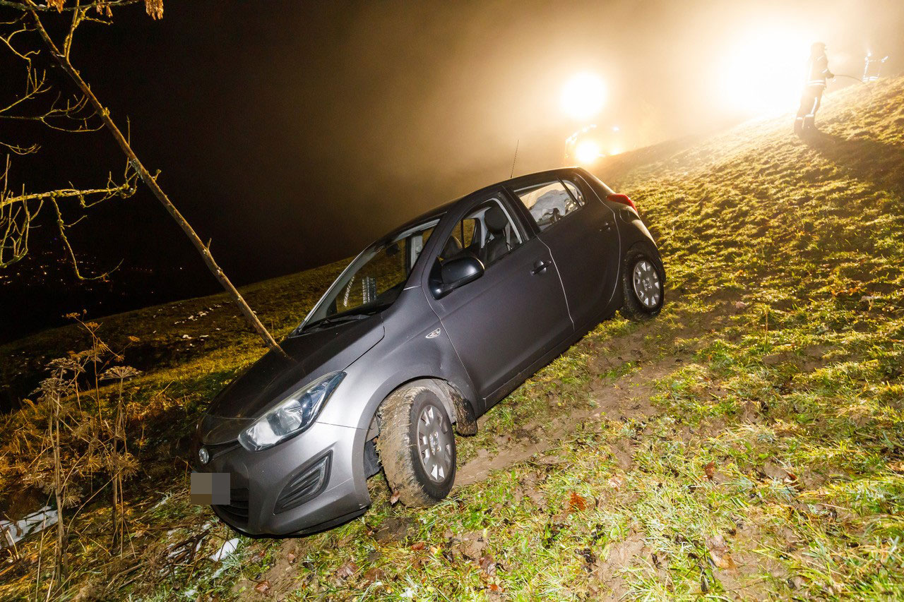 Der verunfallte Pkw kam auf einer abschüssigen Wiese zum Stehen – verletzt wurde niemand.