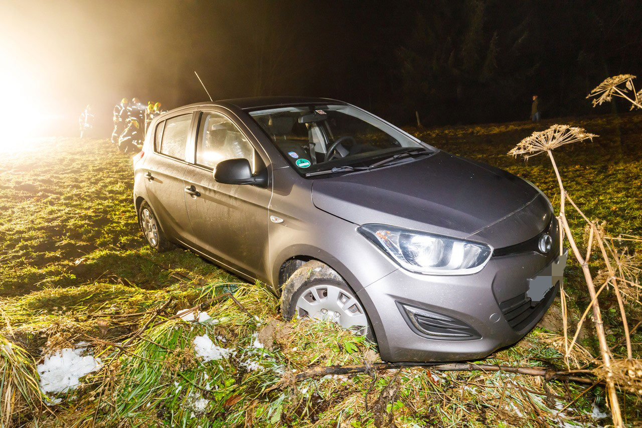 Der Wagen blieb nach dem Abrutschen vor einem Waldstück stehen – glücklicherweise ohne Schaden.