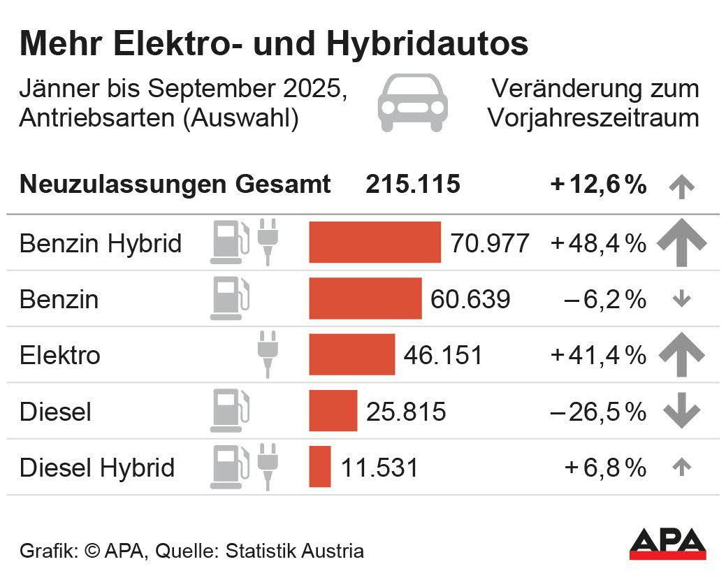 Österreichs Automarkt hat in den ersten neun Monaten des Jahres 2025 kräftig zugelegt. Wie die Statistik Austria mitteilt, wurden zwischen Jänner und September insgesamt 215.115 neue Pkw zum Verkehr zugelassen – das entspricht einem Plus von 12,6 Prozent im Vergleich zum Vorjahreszeitraum. Besonders gefragt waren Fahrzeuge mit Benzin-Hybridantrieb, deren Zulassungszahlen um beeindruckende 48,4 Prozent stiegen.