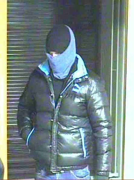 Ca. 20-30 Jahre alt, ca. 180 cm groß, eher schlank, trug eine blaue, verwaschene Jeans, eine schwarze Daunenjacke mit hellblauem Kragen und blauen Ränder an den Taschen. Im Brustbereich befand sich ein hellblaues Emblem der Firma “Puma”. Er trug Handschuhe der Marke “Adidas” und war mit einem hellen Schal und einer schwarzen Kappe maskiert. Der Räuber sprach deutsch, eventuell mit ausländischem Akzent.