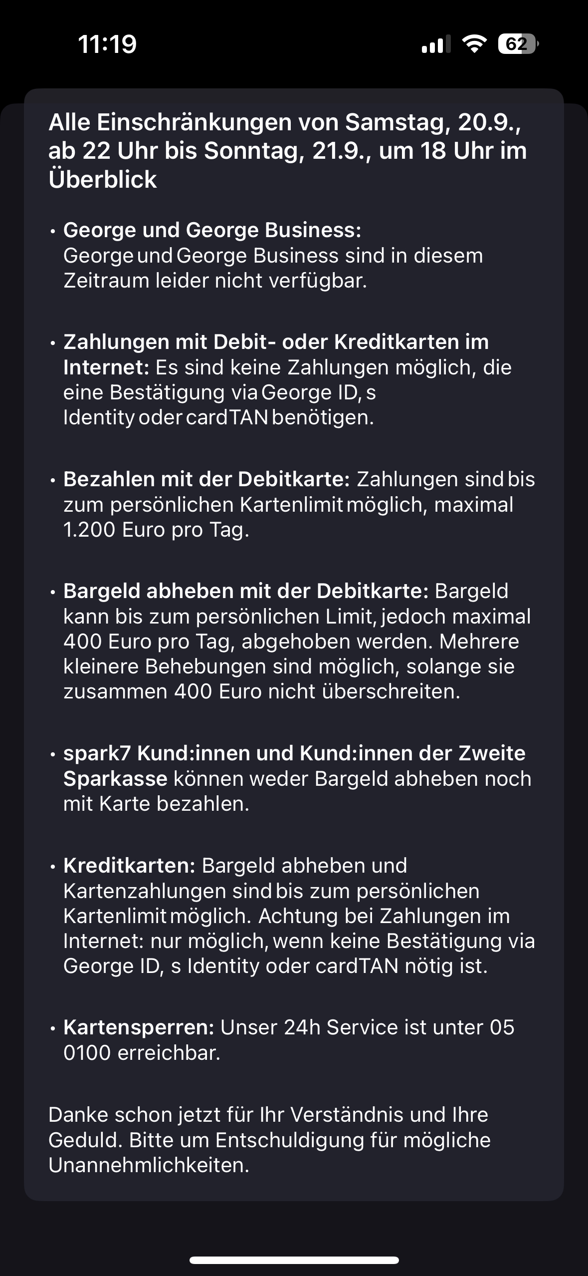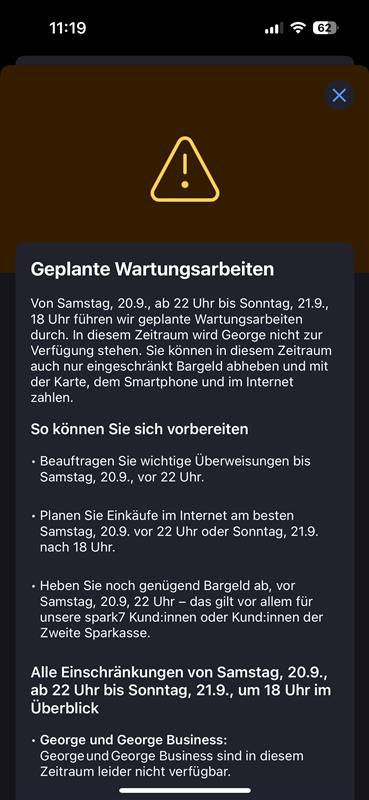 Zwischen Samstag, dem 20. September, ab 22.00 Uhr, und Sonntag, dem 21. September, bis etwa 18.00 Uhr werden sämtliche digitalen Bankdienstleistungen nur eingeschränkt verfügbar sein. Die App George – Herzstück des Online-Bankings – ist während dieser Zeit vollständig offline. Auch Kartenzahlungen und Bankomaten funktionieren nur teilweise.