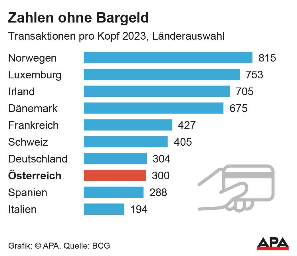 Österreich hinkt anderen Ländern in Sachen bargeldloses Zahlen weiter deutlich hinterher. Bei den elektronischen Transaktionen landet die Alpenrepublik mit durchschnittlich 300 Zahlungen im Jahr 2023 im Vergleich mit 16 anderen europäischen Ländern erneut im untersten Drittel, wie aus einer am Montag veröffentlichten Analyse der Boston Consulting Group (BCG) hervorgeht. Weniger Transaktionen wiesen nur Spanien (288), Malta (243) und Italien (194) auf.
