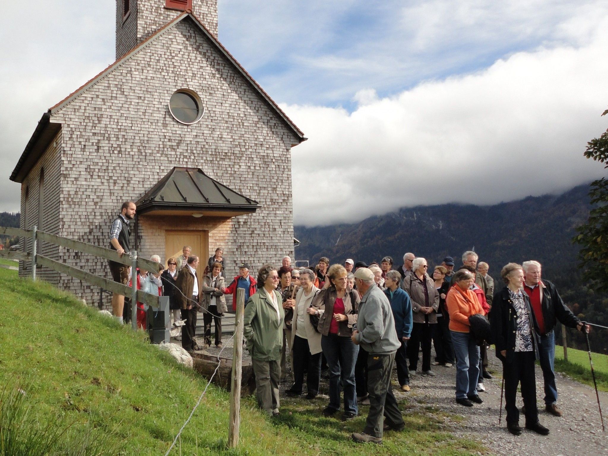 Dort angekommen, warteten bereits die Führer Frau Irmgard bereuter und Timo Hagspiel um uns die Wälder-Gemeinde zu präsentieren. Ein Bus brachte eine Gruppe nach Rindberg. Im Jahre 1999 waren in diesem Gebiet gewaltige Erdrutschungen. Ca. 3 Mio. m3 Erdmasse waren in Bewegung geraten. 18 Häuser waren davon betroffen. Alle wurden wieder instand gesetzt. Nur einesließ man als Zeugnis stehen. Es befindet sich heute zur Besichtigung auf des nachbars Grundstück mit 18° Schieflage. In der ebenfalls betroffenen, 2003 erneuerten Rindberg-Kapelle wurde abschließend gemeinsam ein Danklied für den unfallfreien Verlauf des abgelaufenen Ausflugs-Jahres gesungen.