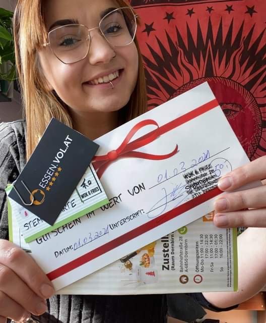 In Woche drei ging es im Bezirk Dornbirn darum, das liebste Restaurant der Vorarlberger*innen zu finden. Das Wok&Fries aus Dornbirn konnte zahlreiche Bewertungen einfahren und Natalie M. durfte sich über einen Gutschein im Wert von 50 Euro freuen.
