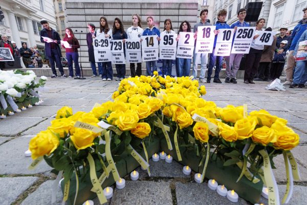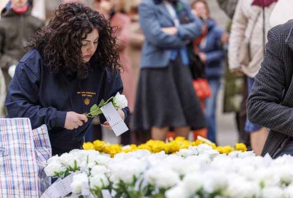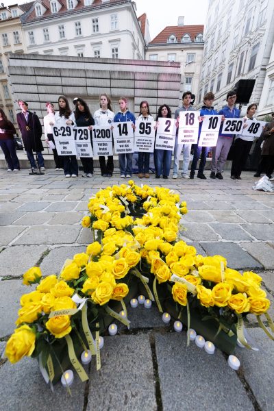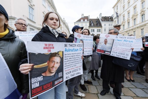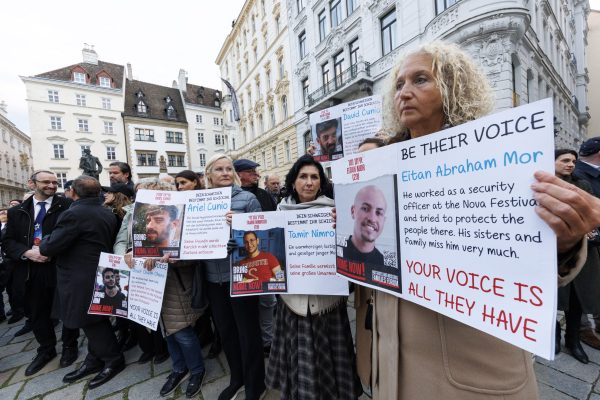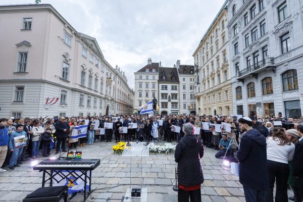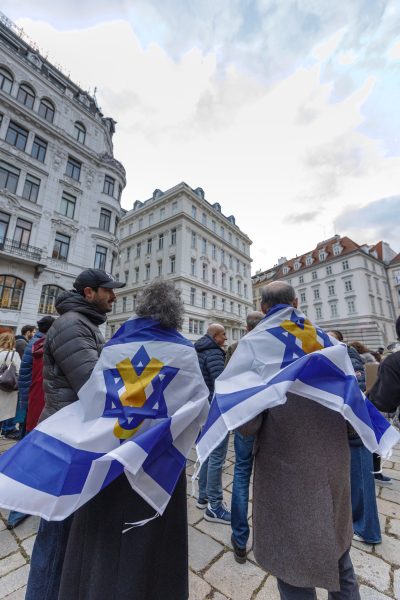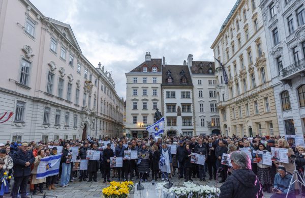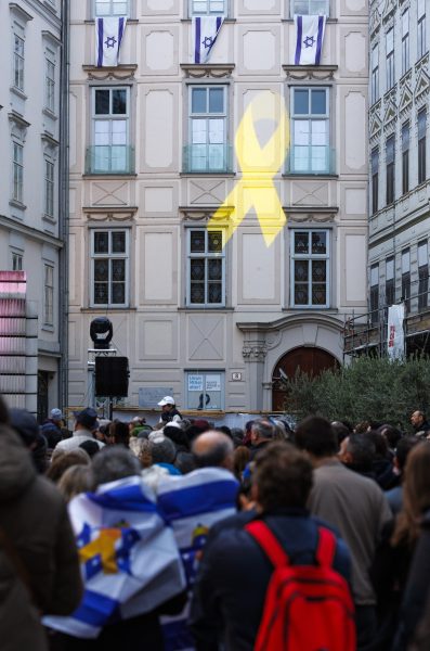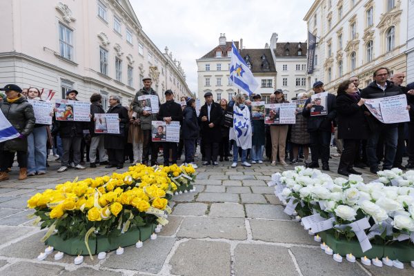 Vor dem Mahnmal für die österreichischen jüdischen Holocaust-Opfer wurde auch an jene 48 Israelis erinnert, die sich bis heute in Geiselhaft im Gazastreifen befinden. “Bringt sie nach Hause”, forderten die Kundgebungsgäste auf Schildern, die die Konterfeis der noch nicht befreiten Geiseln zeigten.