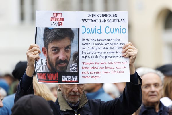 Während Psalmen und Totengebete zu Ehren der Opfer gesprochen wurden, schwenkten einige Kundgebungsteilnehmer israelische Fahnen und hielten Schilder mit den Gesichtern der Geiseln in die Höhe. “Zwei Jahre in der Hölle”, war auf manchen zu lesen. Nur kurz wurde die einstündige Veranstaltung von “Free Palestine”-Rufen aus der Ferne gestört. Das große Security- und Polizeiaufgebot brachte die Rufe aber schnell zum Verstummen.