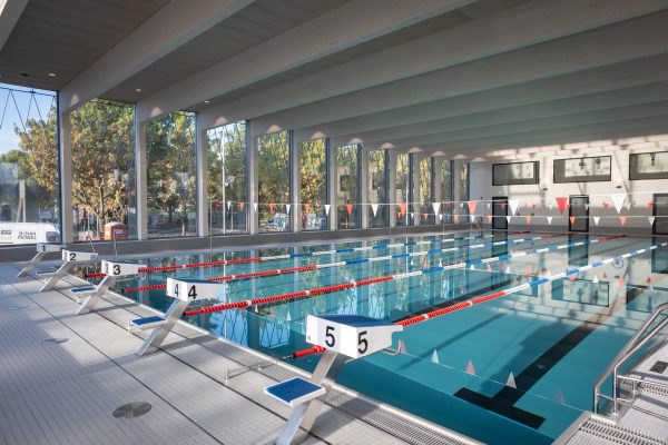 Das Herzstück der neuen Schwimmhalle ist ein 25 x 12,5 Meter großes Sportbecken. Die Nebeneinrichtungen wurden mittels zweier Verbindungsbrücken an das bestehende Gebäude angebunden, wo sich auch der barrierefreie Haupteingang für beide Hallen befindet.