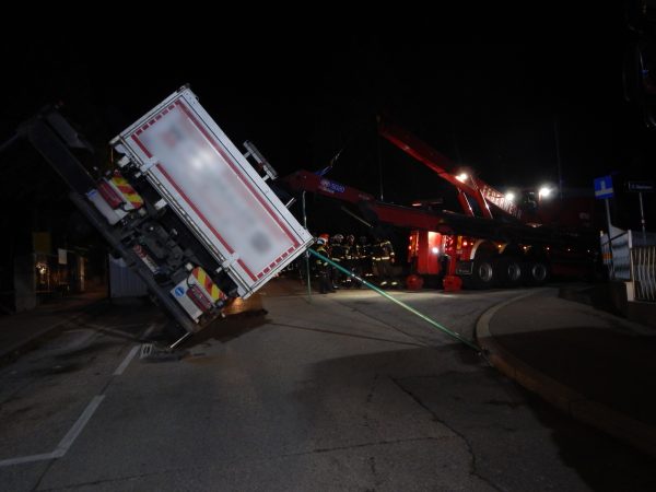 Die Einsatzkräfte der Feuerwehr sicherten das Unfallfahrzeug zunächst gegen weiteres Abrutschen. Mithilfe von Pölzrohren, Radkeilen, Kanthölzern und einer Seilwinde wurde das Gefährt stabilisiert. In einem mehrstufigen Verfahren hoben sie den Ausleger an, um zunächst den beschädigten Anhänger zu entfernen. Anschließend wurde der Kranausleger eingefahren und das Fahrzeug mit zwei Abschleppkränen wieder aufgerichtet.