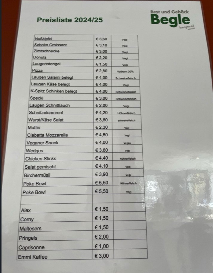 In der großen und in der Mittagspause bietet die Bäckerei Begle nun eine Auswahl an Speisen an, die auch in ihren Filialen erhältlich sind. Dazu zählen Bäckereiwaren, Schnitzelsemmel (4,20 Euro), abgepackter Salat (4,50 Euro) sowie Reisbowls mit Hühnchen oder Gemüse (5,50 Euro). Zusätzlich wird ein warmes Gericht angeboten. Ein vollwertiges Menü wird allerdings nicht mehr serviert, da der Verkaufspreis dafür bei etwa 11 Euro liegen würde. „Das ist für Schüler zu teuer“, erklärt Fenkart.