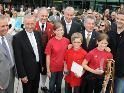 Rund 60 Jungmusiker sorgten für eine feierliche Umrahmung der Festspieleröffnung (im Bild v.l.: Hards Bürgermeister Hugo Rogginer, Landeshauptmann Herbert Sausgruber, Blasmusik-Landesobmann Wolfram Baldauf, Feldkirchs Bürgermeister Wilfried Berchtold, Bundespräsident Heinz Fischer, Kapellmeister Reinhold Schäfer sowie die ausgezeichneten Jungmusiker)
