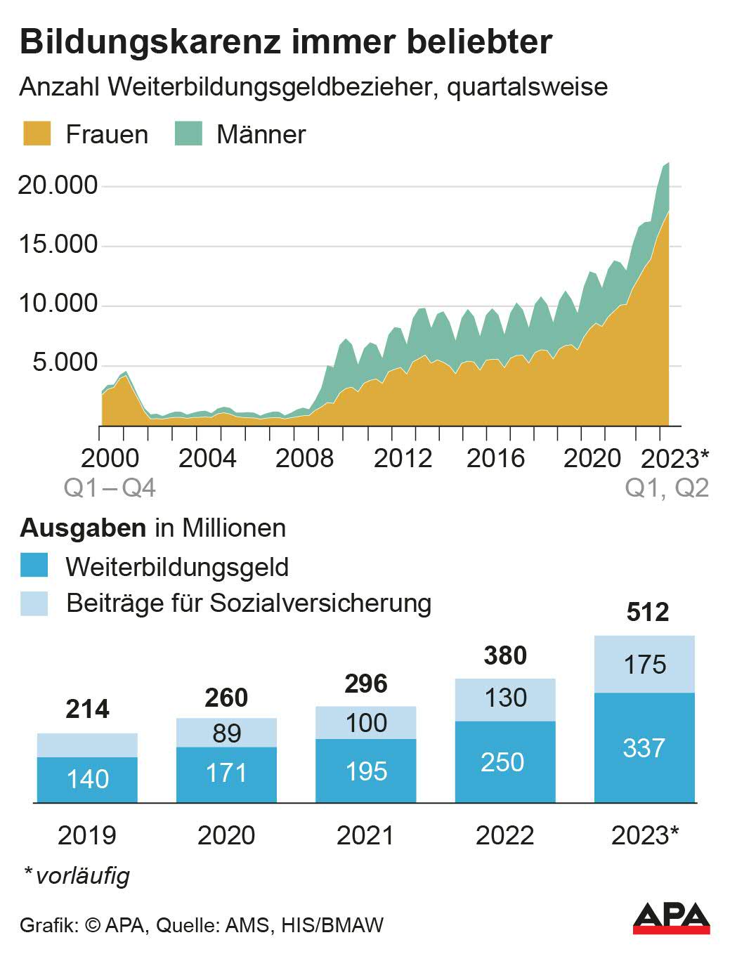 Die Zahl der Beschäftigen in Österreich, die in Bildungskarenz gehen, steigt. Die Kosten für Weiterbildungsgeld inklusive Sozialversicherungsbeiträge erhöhten sich von 380 Mio. Euro 2022 auf 512 Mio. Euro 2023, geht aus einer Auswertung der wirtschaftsliberalen Denkfabrik Agenda Austria hervor.